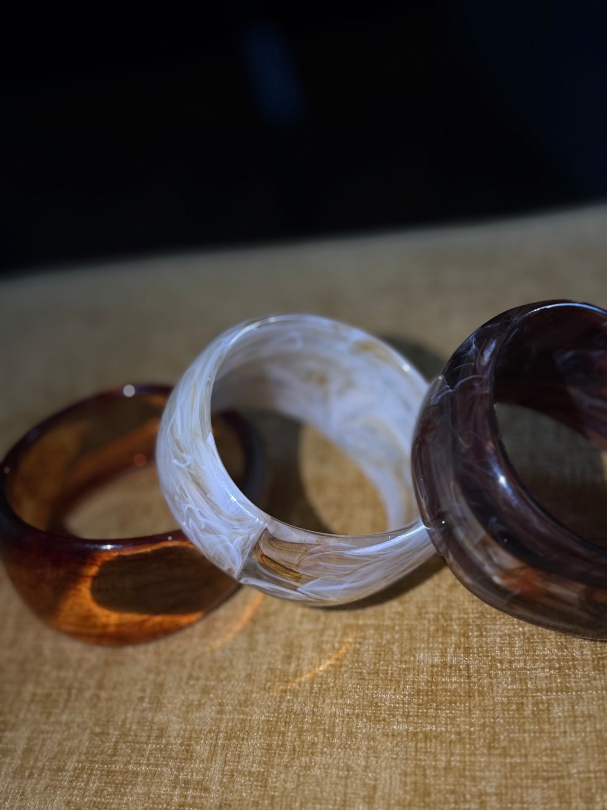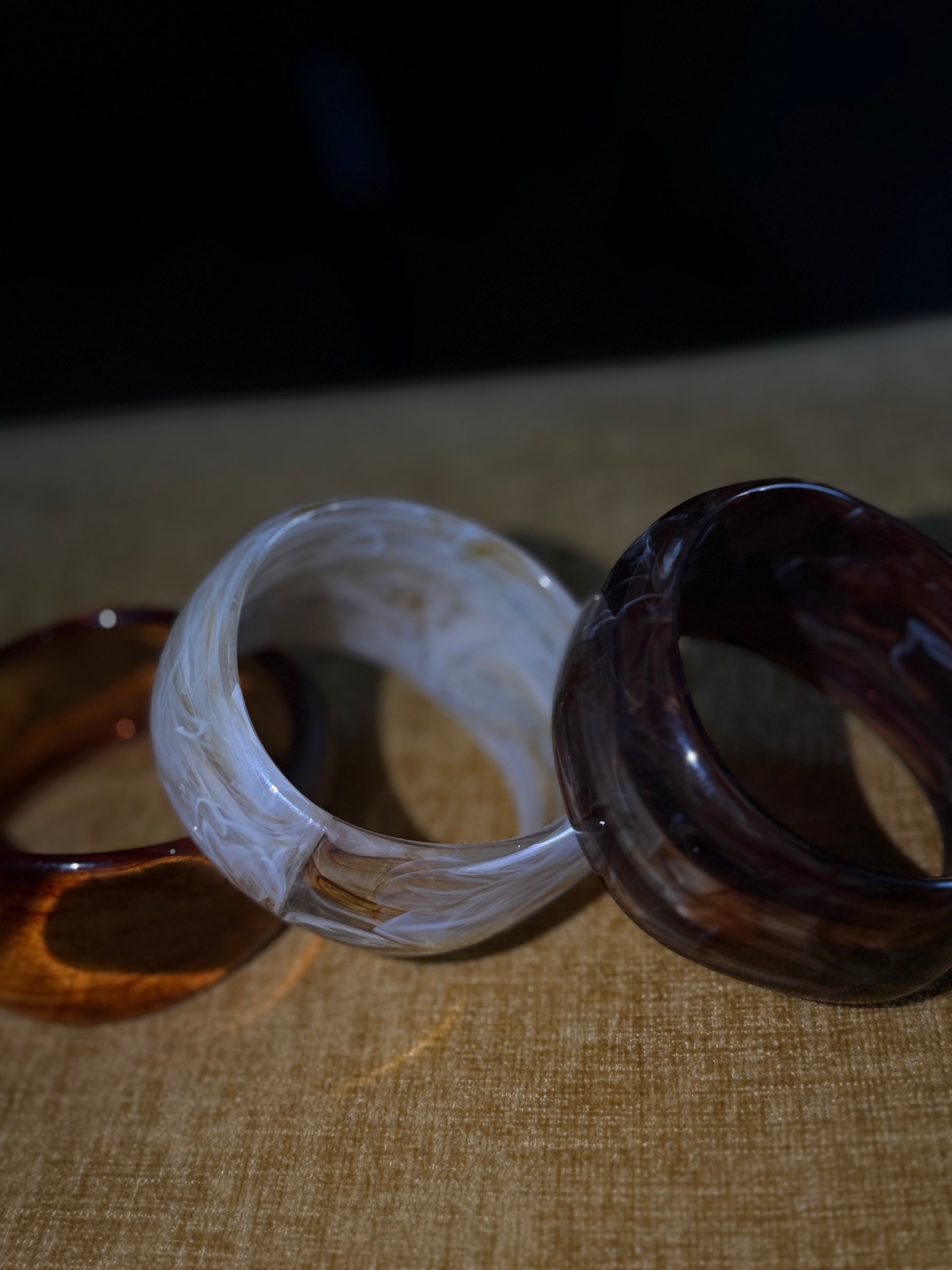 Rooted in warmth and natural tones — this trio features two brown bangles in complementary shades, one deep and one soft. Paired with a bright tan bangle swirled with hints of brown, the set brings a cozy, grounded vibe with a touch of artistic flair.