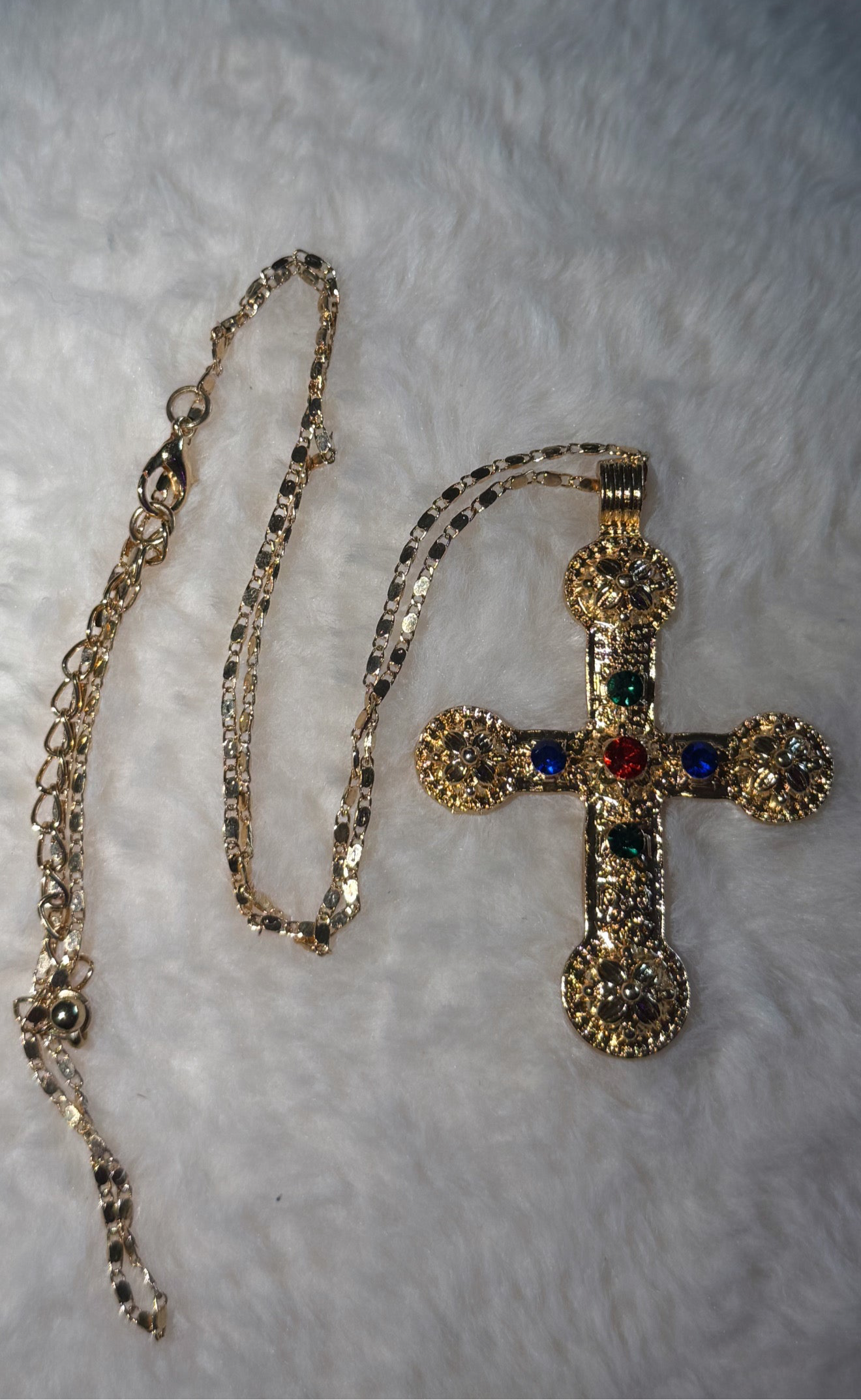 A bold twist on a classic — this gold cross necklace features vibrant blue and red enamel dots that add a pop of color and personality to a timeless symbol. Perfect for layering or wearing solo, it blends faith, fashion, and flair in one striking piece.