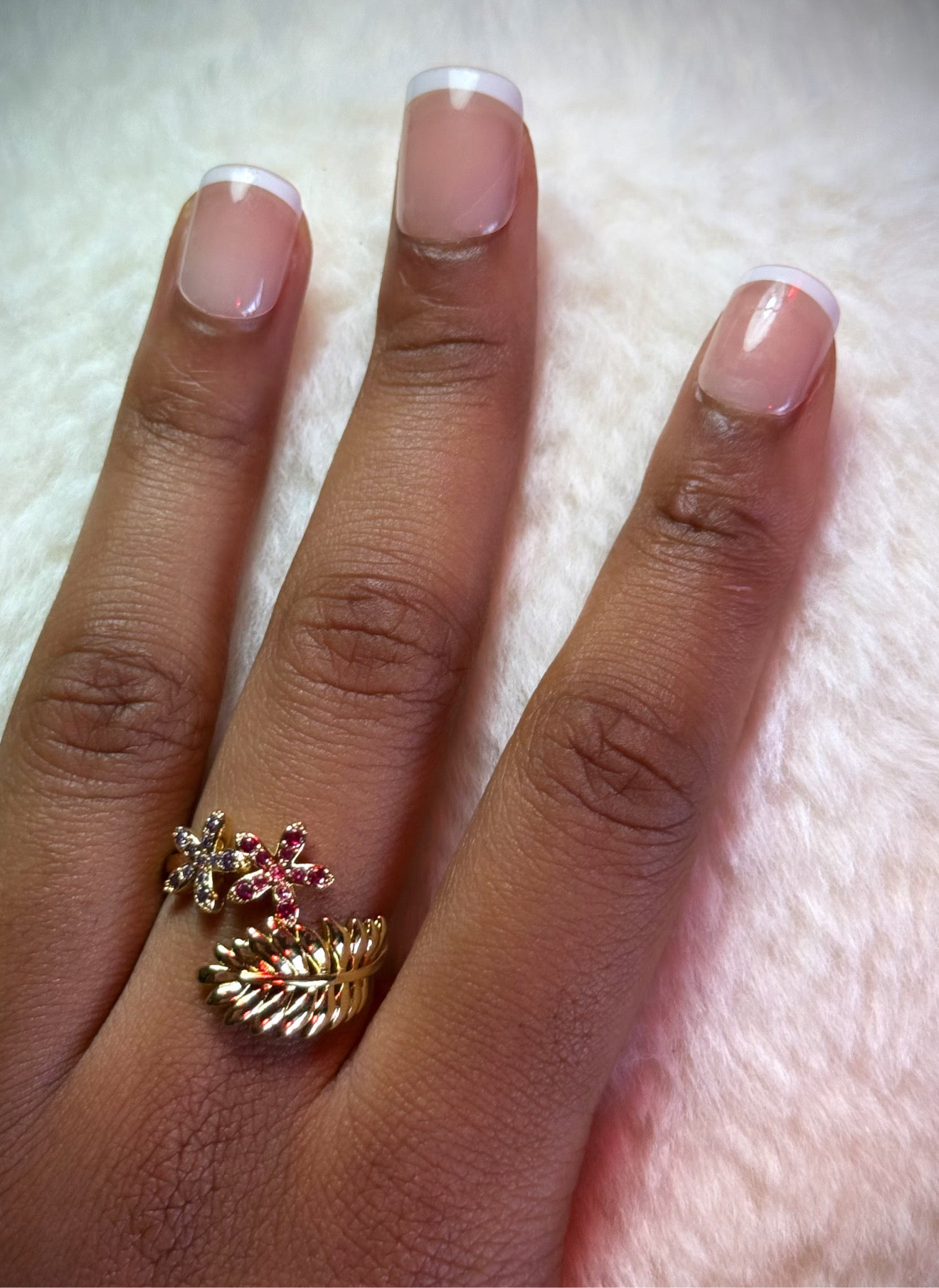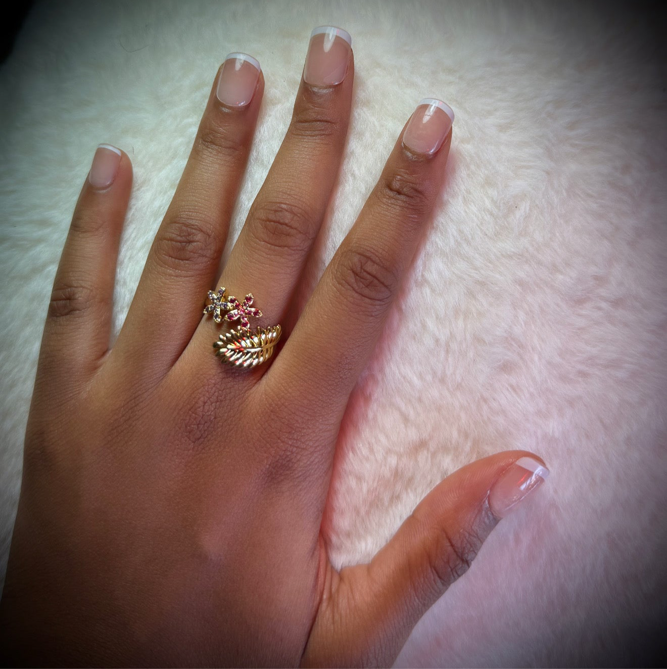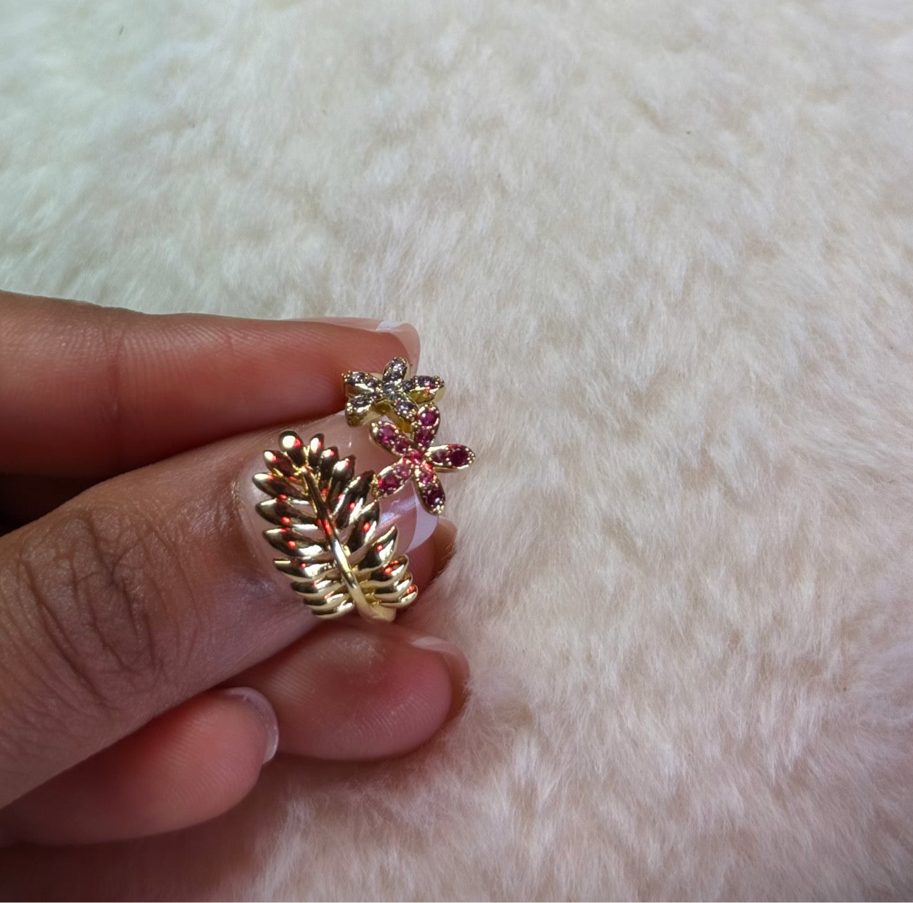 Where nature meets sparkle — this gold ring features a graceful leaf on one side, balanced by two dazzling stars on the other. One star shines bright in classic brilliance, while the other pops with playful pink stones, adding a touch of bold, feminine magic.