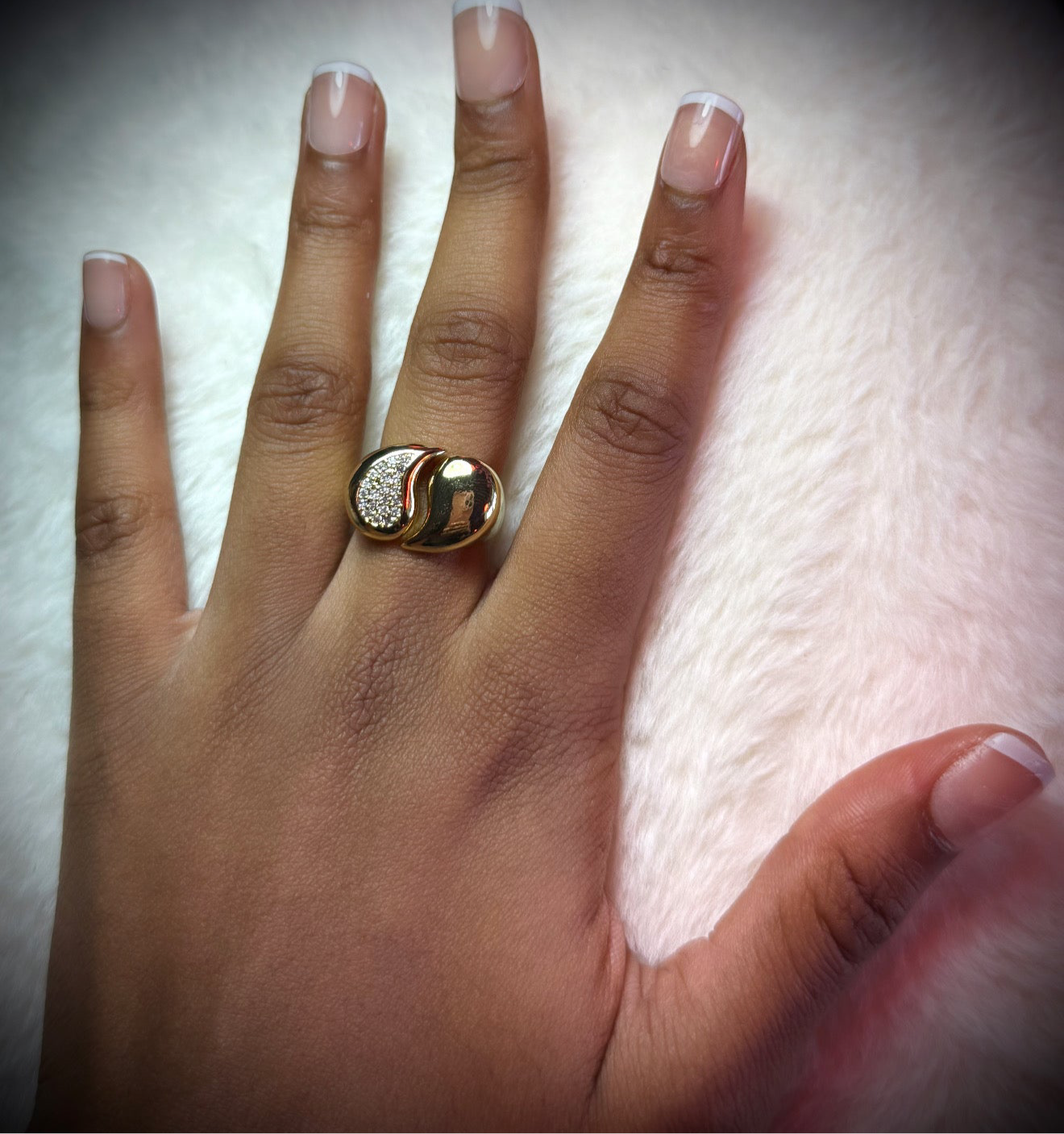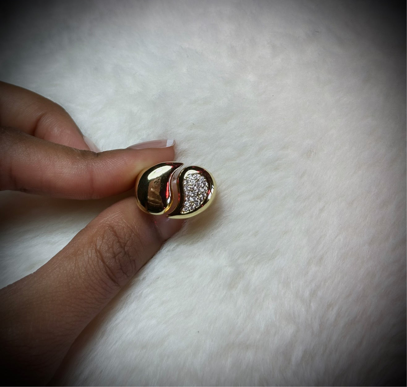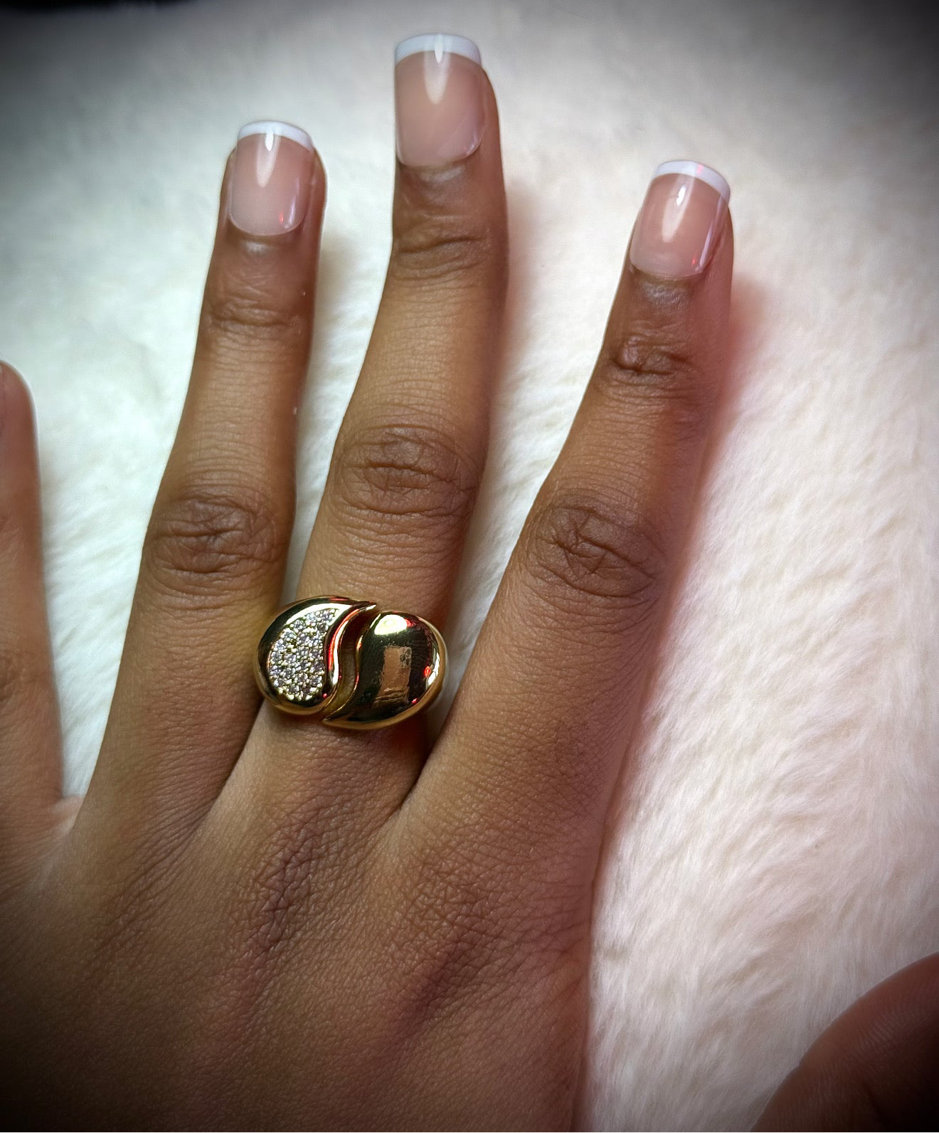 Delicate yet distinctive, this open-style ring features two teardrop shapes facing each other — one crafted in polished gold, the other encrusted with shimmering stones. The contrast creates a balanced, eye-catching look that brings modern elegance with a touch of playful asymmetry.