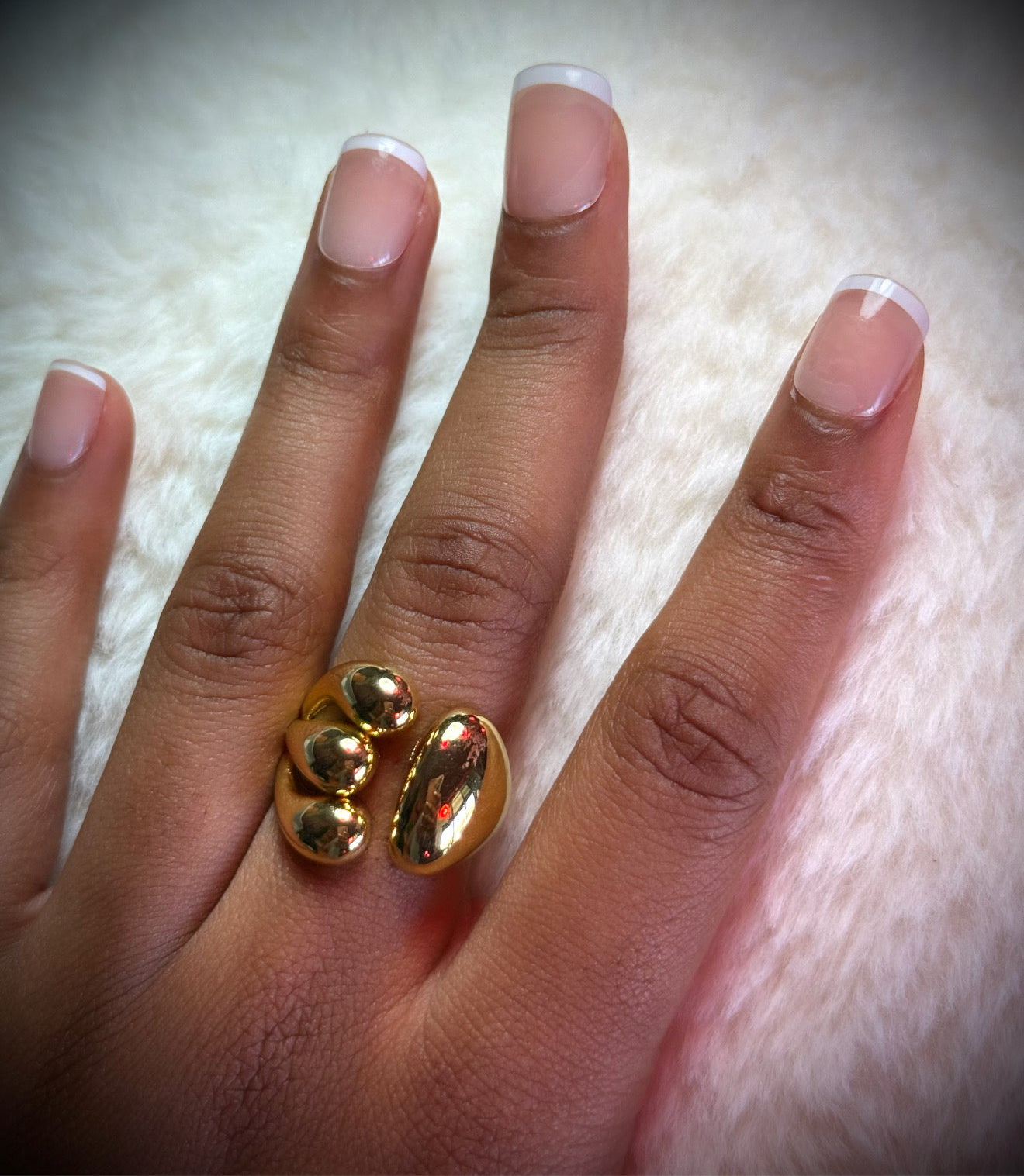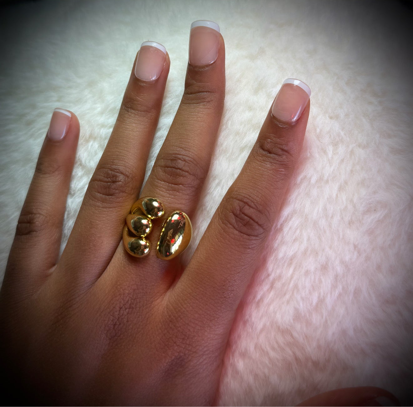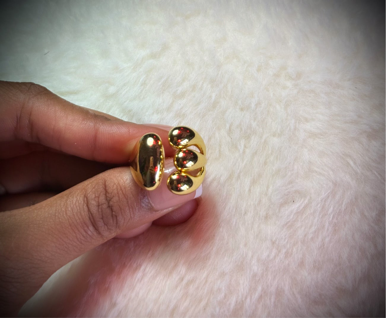 Sleek and sculptural, this wrap-around ring features a fluid gold band that gently curves around the finger. One side embraces with a smooth, polished finish, while the other is detailed with three parallel lines, adding a modern, textural contrast. A subtle statement piece with a refined edge.
