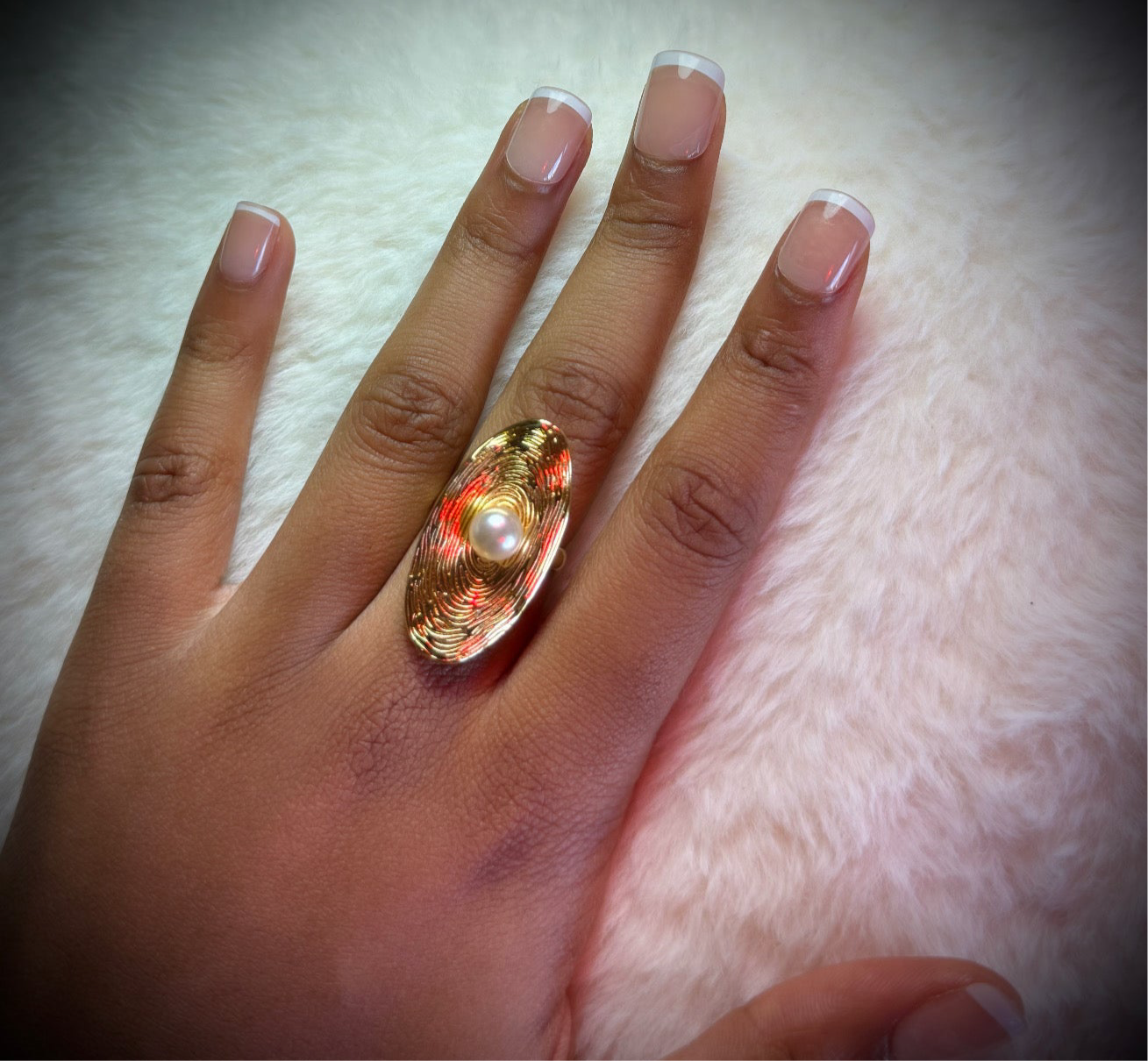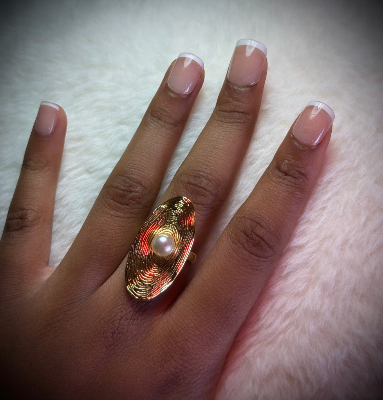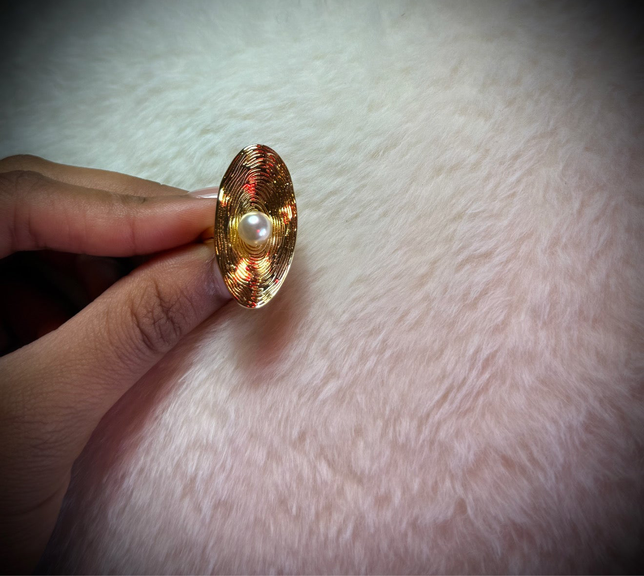 Elegance in every curve — this gold oval ring features delicate, flowing lines that wrap around its shape, drawing the eye to a luminous pearl nestled at the center. A timeless blend of texture, shine, and softness.