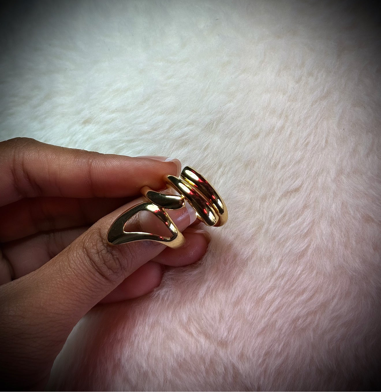 An artistic pairing made to stand out, this two-piece ring set features abstract, sculptural designs. One ring showcases a bold swirling form, while the other complements it with clean double-line detailing. Worn together or separately, they offer a modern, minimalist edge with a unique twist.