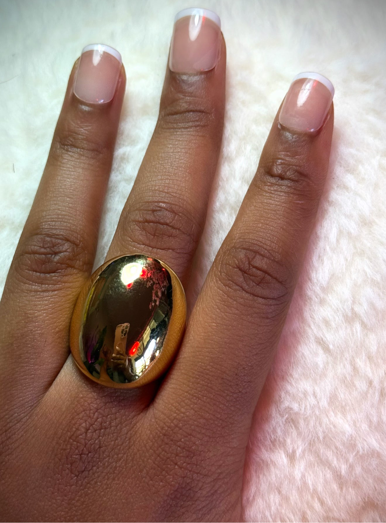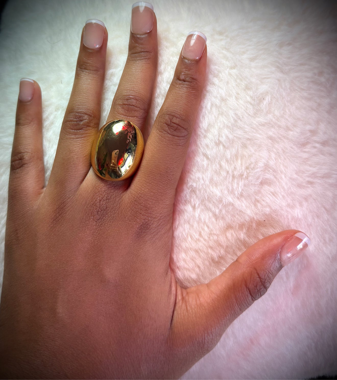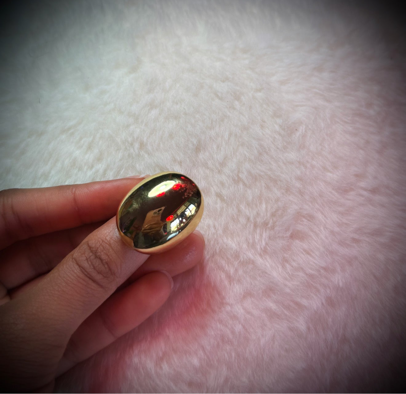 Bold and unapologetically golden — this chunky, oval-shaped ring makes a statement with its smooth curves and radiant shine. A sculptural piece that brings luxury and attitude to any look.