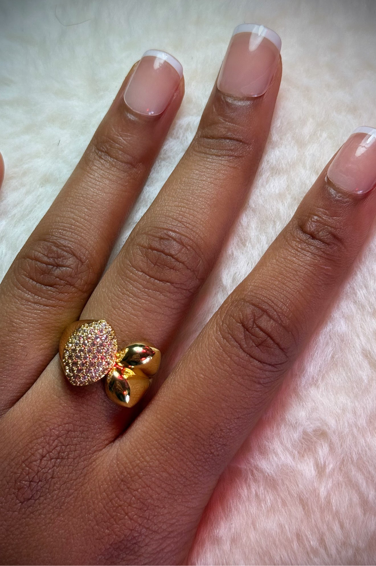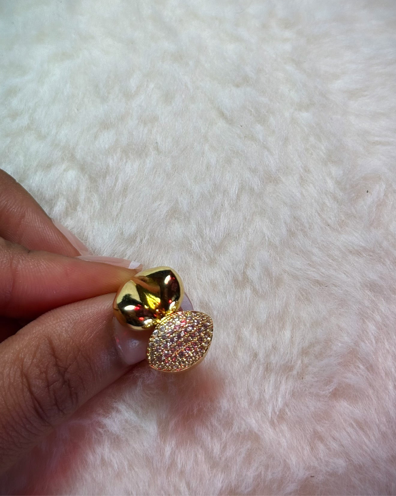 This gold ring strikes the perfect balance between bold and refined — one side dazzles with blinged-out brilliance, while the other features a smooth, double-layered gold shape with soft, circular curves. A modern design with effortless edge.
