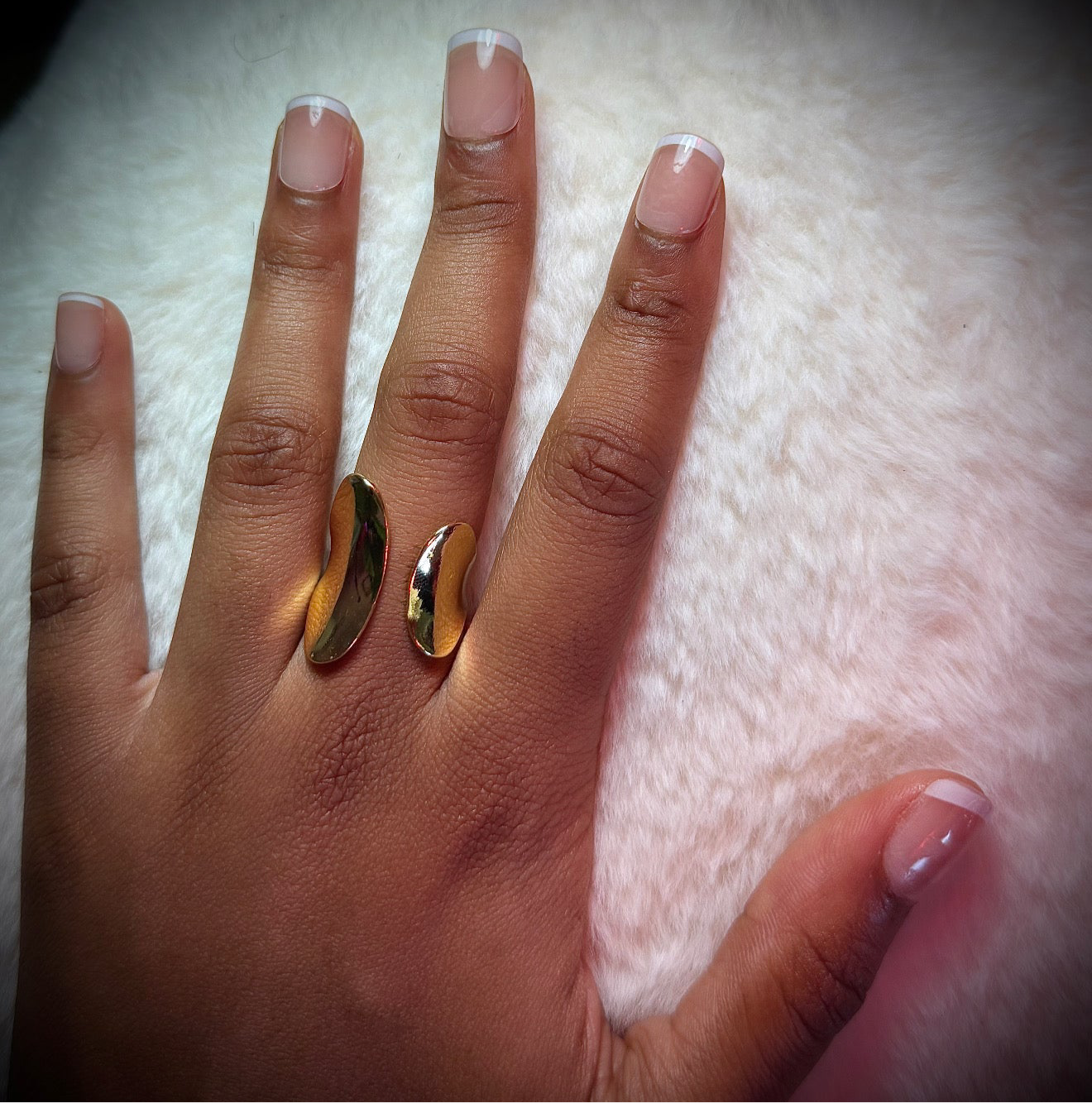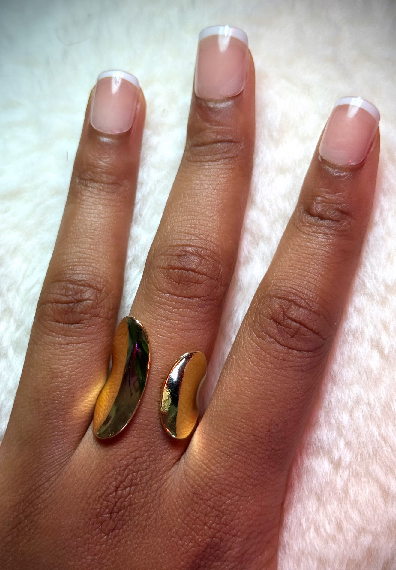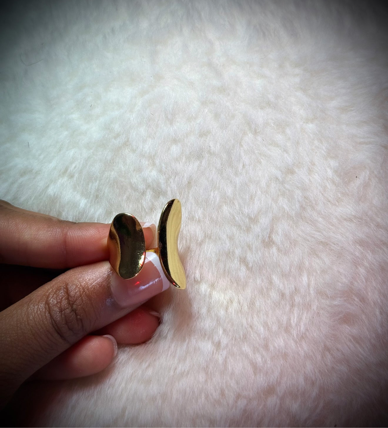 This gold ring features a bold, wonky silhouette with an off-balance twist — one side mirrors the other in shape but stands larger, creating an eye-catching play on symmetry. Sculptural, sleek, and unapologetically unique.
