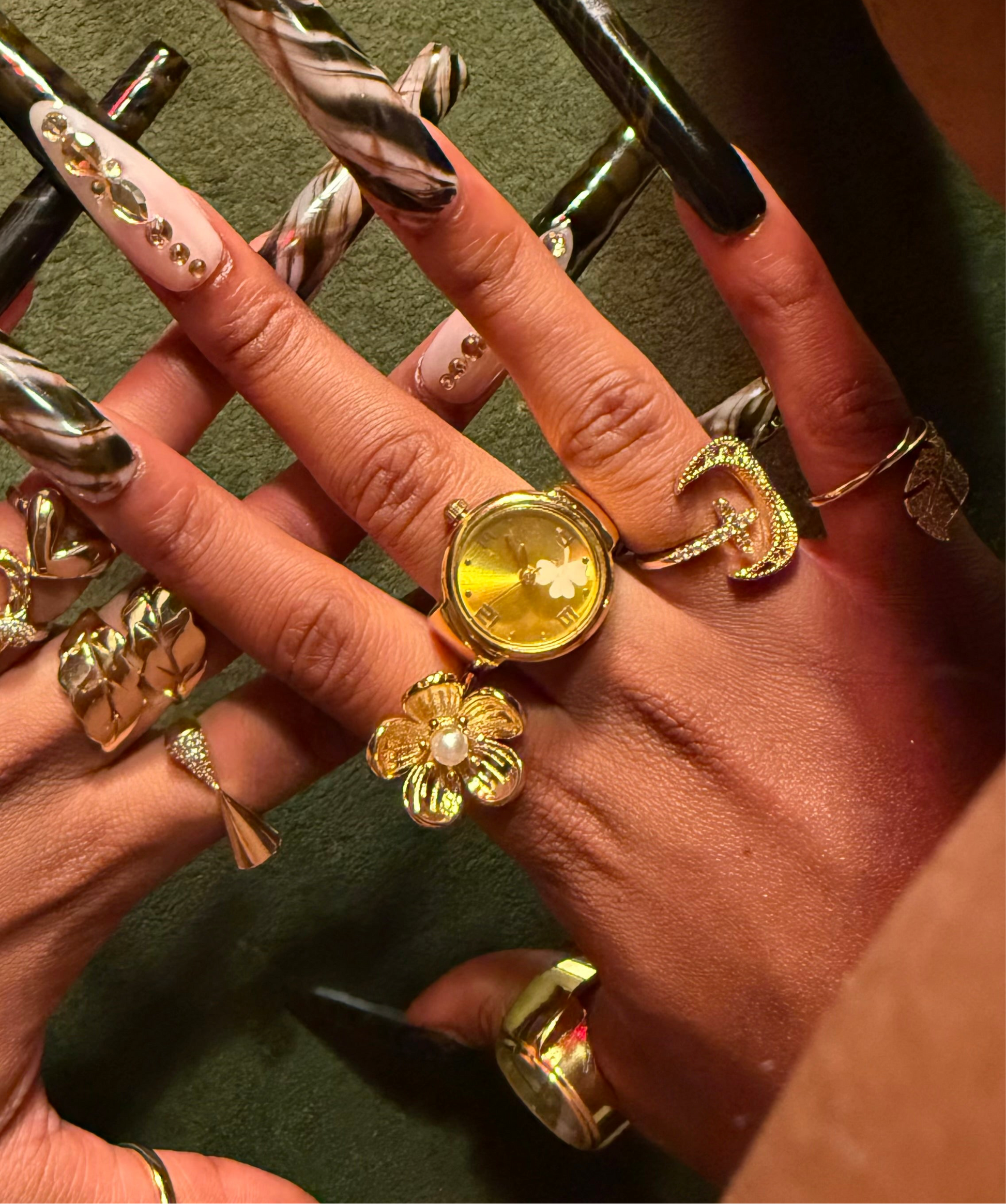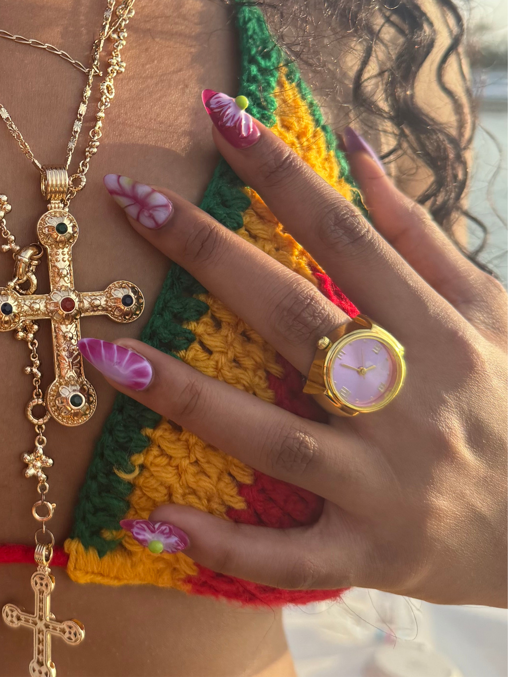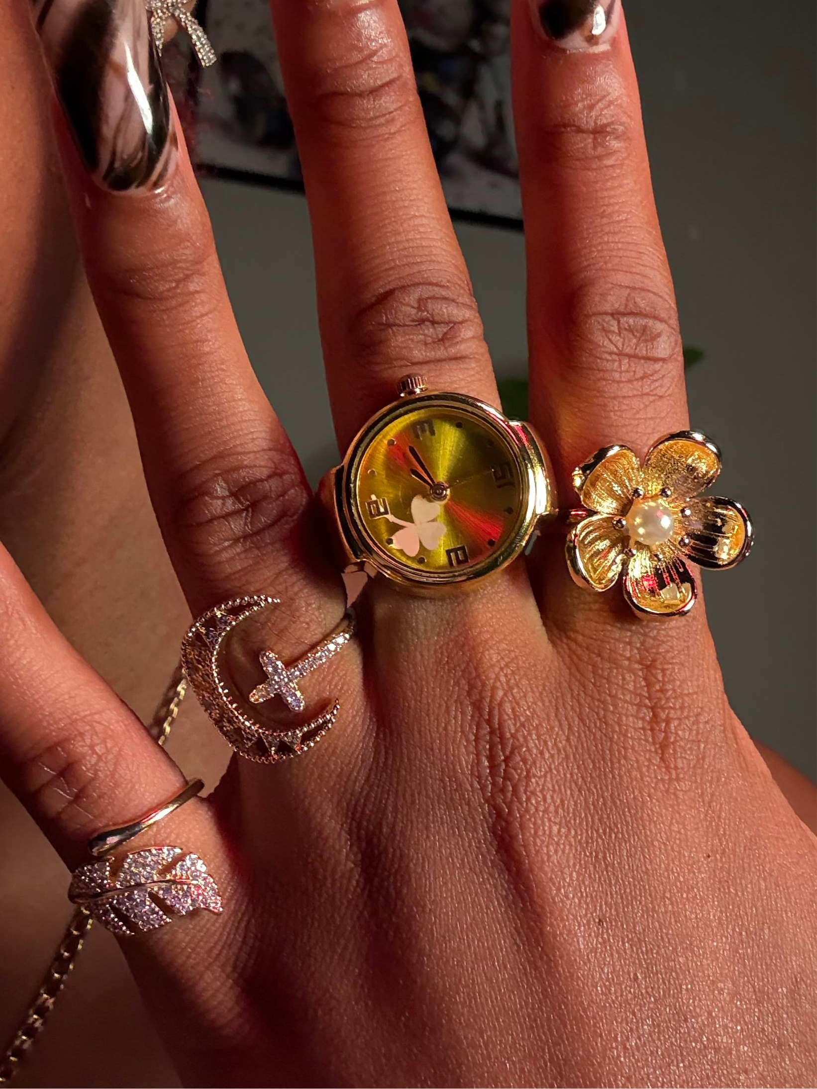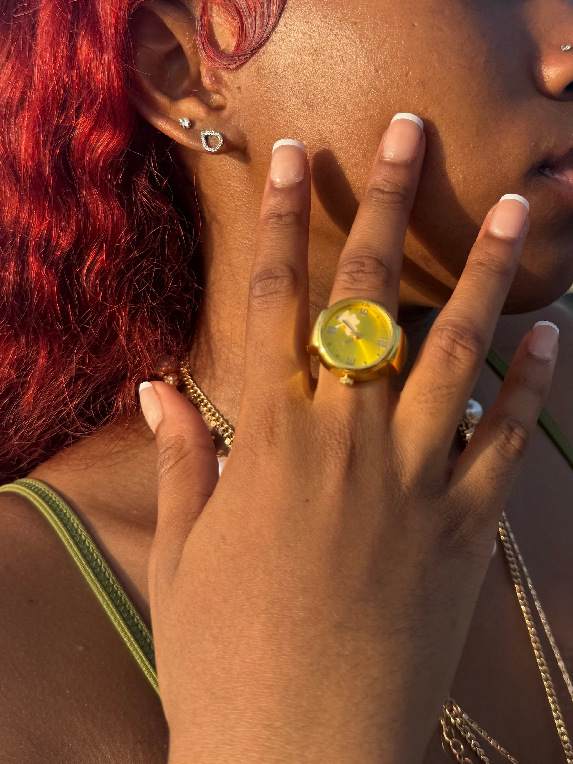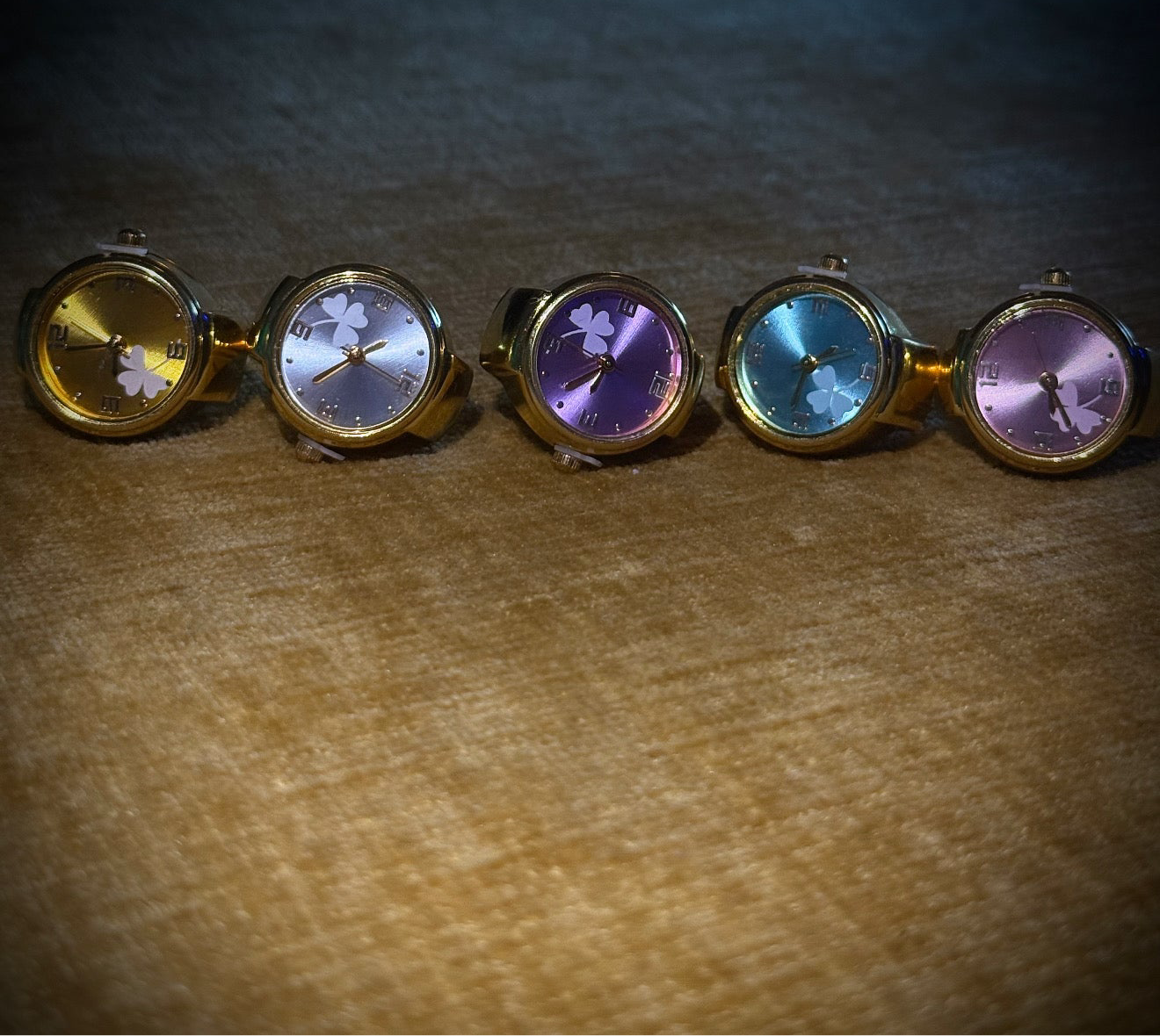 A tiny timepiece with big charm — this delicate watch ring features a real working face beneath clear glass, framed by a sleek gold band. Available in soft hues like blue, pink, yellow, white, and purple, each ring adds a playful pop of color. Handle with care — this dainty design is as fragile as it is fabulous.